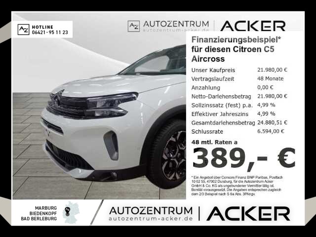 Citroen C5 Aircross Pure Tech 130 AT8 Max RFK ACC -41%* 21.790 €MwSt. ausw.Gebrauchtfahrzeug34.020 km01.06.202496 kW/ 131 PSBlauAutomatikSuperDetails Favorit Vergleichen DetailsVorschau Schließen AusstattungBeschreibung18 BilderKontakt